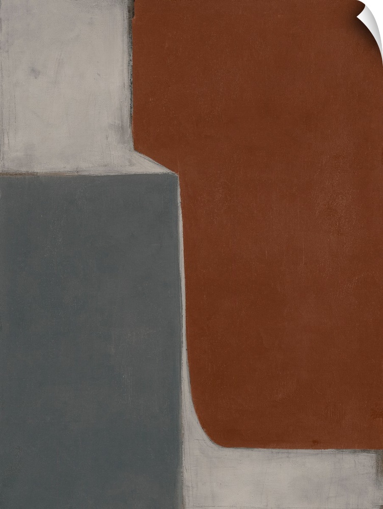 <p>Abstract painting featuring bold blocks of reddish-brown, muted blue-gray, and off-white, creating a minimalist and balanced composition with a textured finish.</p>