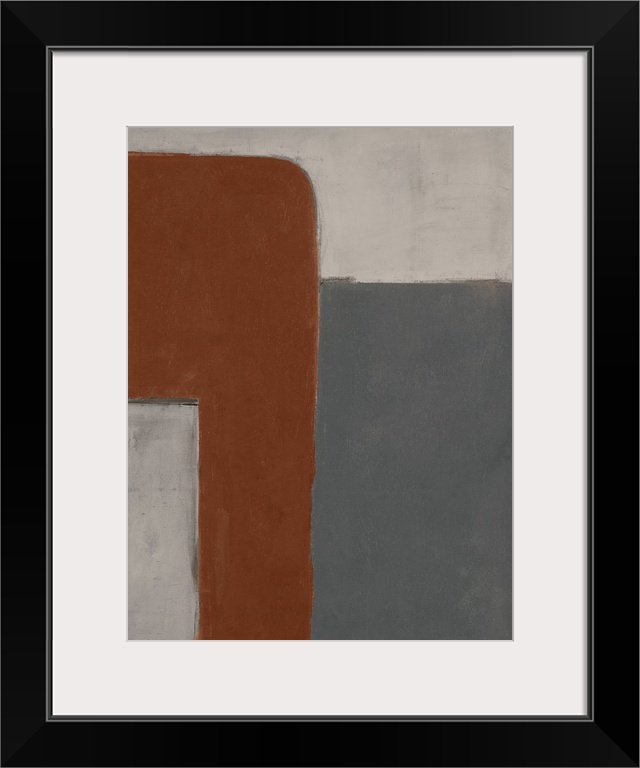 <p>Abstract painting with large blocks of reddish-brown, light gray, and dark gray, featuring a rounded corner and textured brushwork, creating a minimalist and balanced composition.</p>