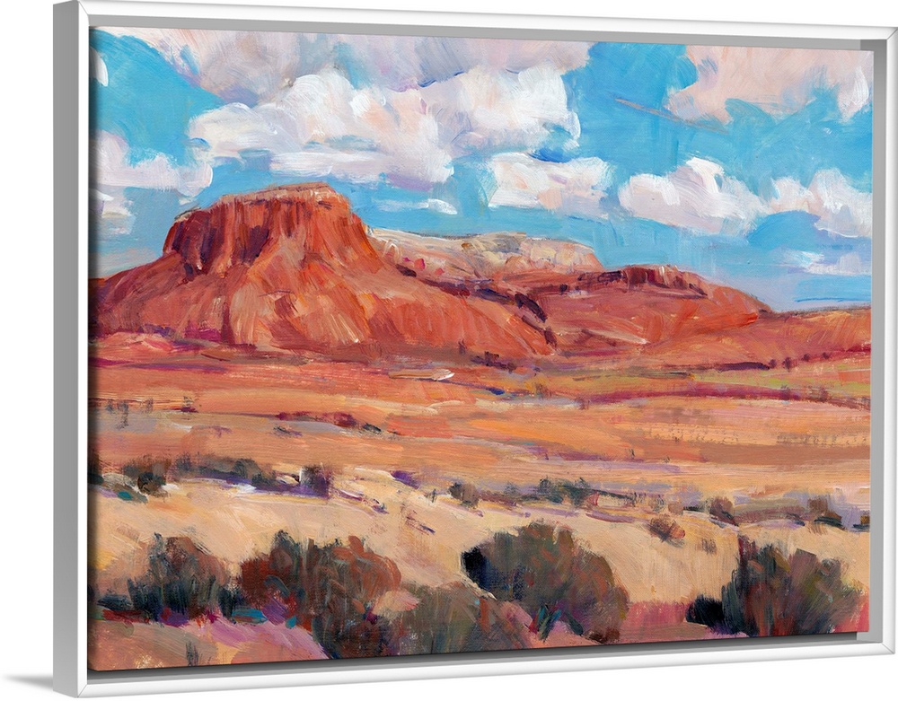 <p>Contemporary landscape painting of a bright blue cloudy sky overlooking a desert.</p>