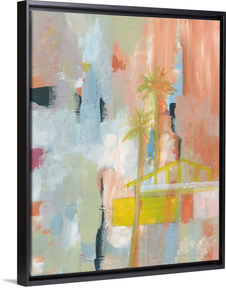 <p>Contemporary abstract painting in shades of orange and blue, with subtle palm tree shapes.</p>