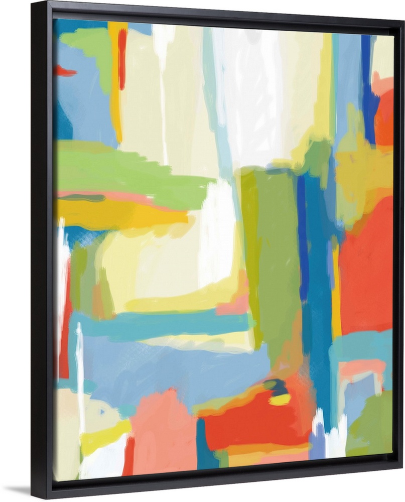 <p>A contemporary abstract with bright colors that pop to give it a modern feel. It contains different shades of blue, green, yellow, orange and pink.</p>