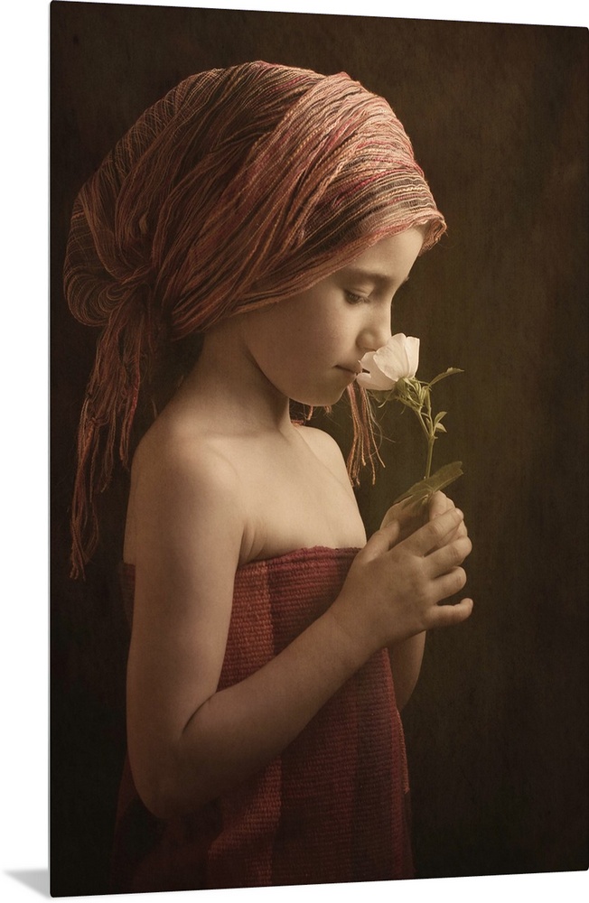 <p>Portrait of a girl wearing robes smelling a flower.</p>