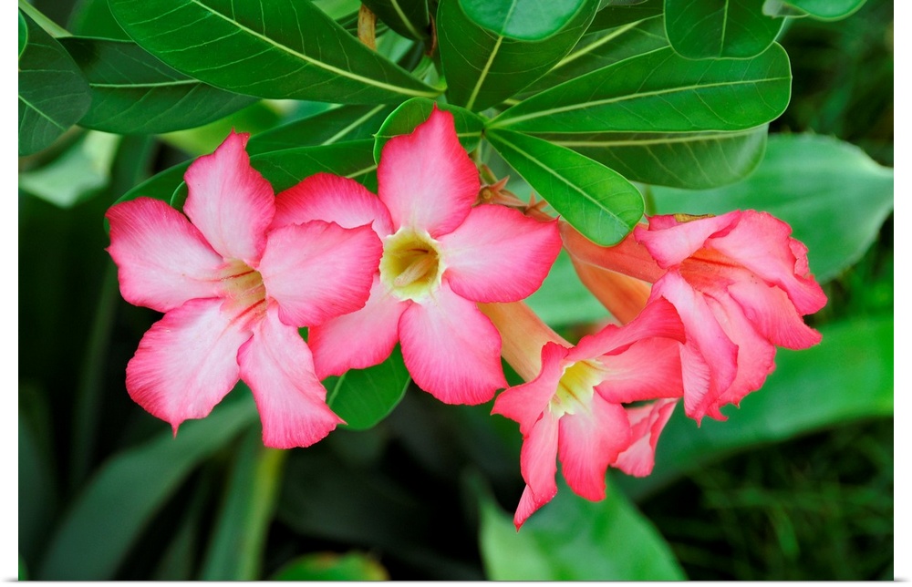 <p>Desert rose blossoms are vibrantly set off against green leaves.</p>