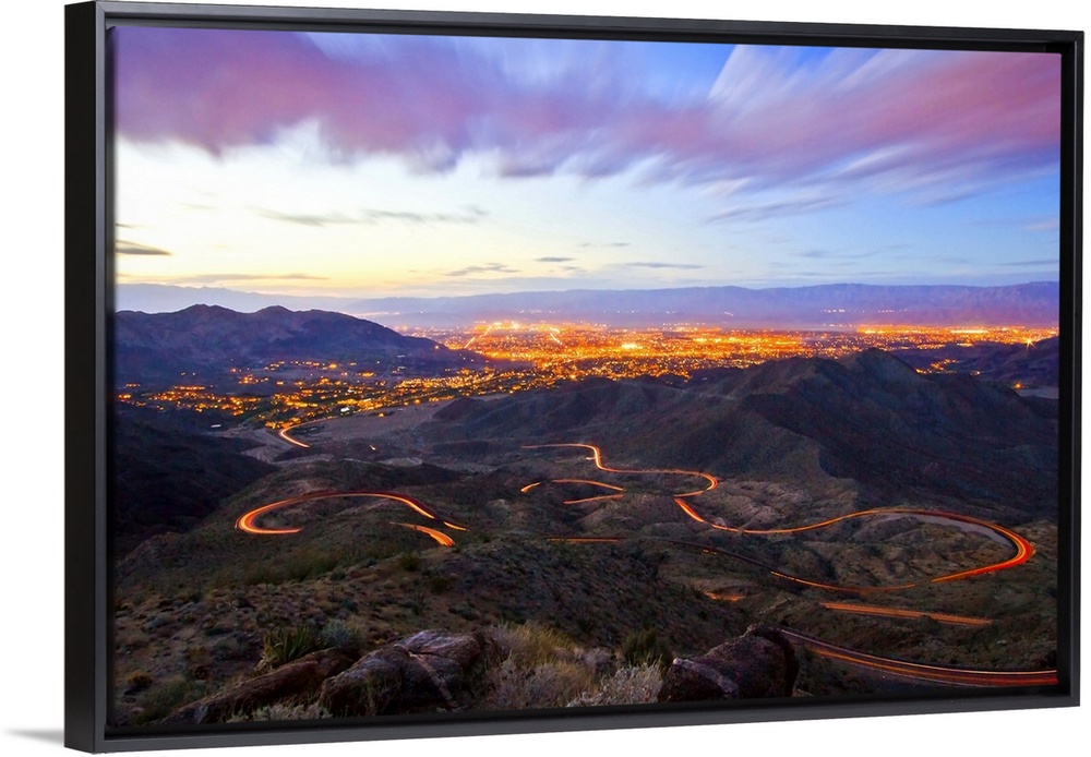 <p>Cities of Desert Hot Springs and Palm Springs. Traffic light trails belong Highway 74 at sunset on cloudy day.</p>