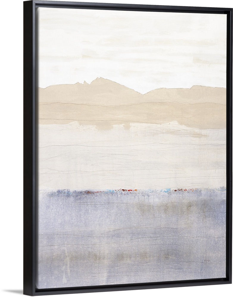 <p>Soft abstract painting with thick, horizontal sections of color stacked on top of each other starting with white, going into beige, and ending with a pale purple that has a band of bright blue, red, silver, and orange at the top.</p>