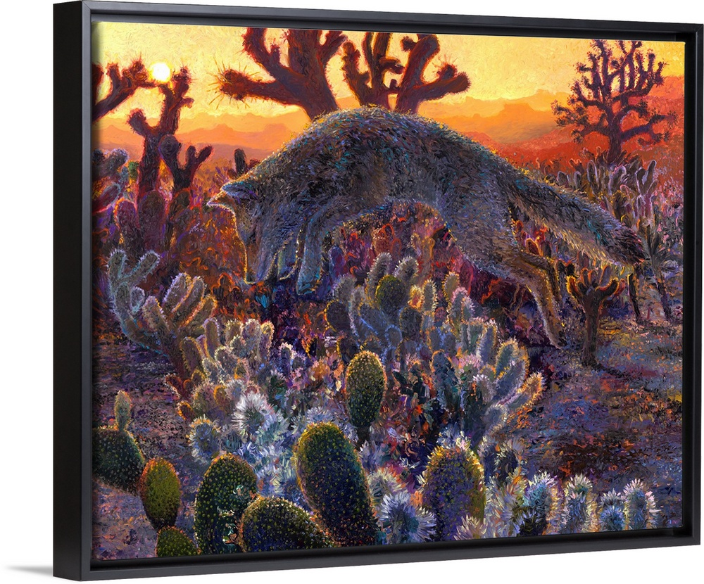 <p>Brightly colored contemporary artwork of a fox pouncing in the desert.</p>