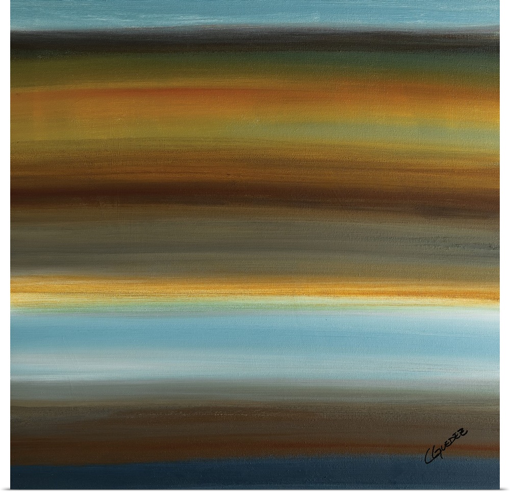 <p>Square abstract painting with stacked horizontal brushstrokes in shades of blue, brown, gray, and yellow.</p>