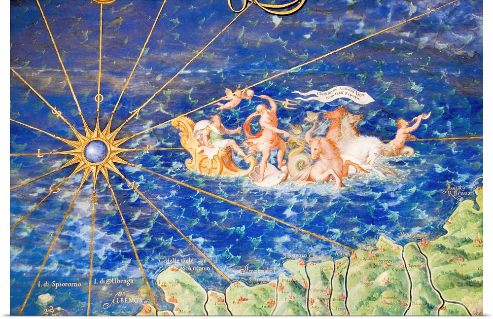 <p>Detail of 16th century map of Liguria. Detail from the map of Liguria commemorating Christopher Columbus and depicting Neptune, the Roman god of the sea, with his chariot. Liguria is a coastal region of Italy. The map of Liguria is contained in the Gallery of Maps in the Vatican Museum. The Gallery of Maps holds maps which were commissioned between 1578 and 1580 to show the regions of Italy and territories of the church. The maps are based on the work of Ignazio Danti, a 16th century Italian priest, mathematician, astronomer and cosmographer, and are an important record of 16th century geography.</p>