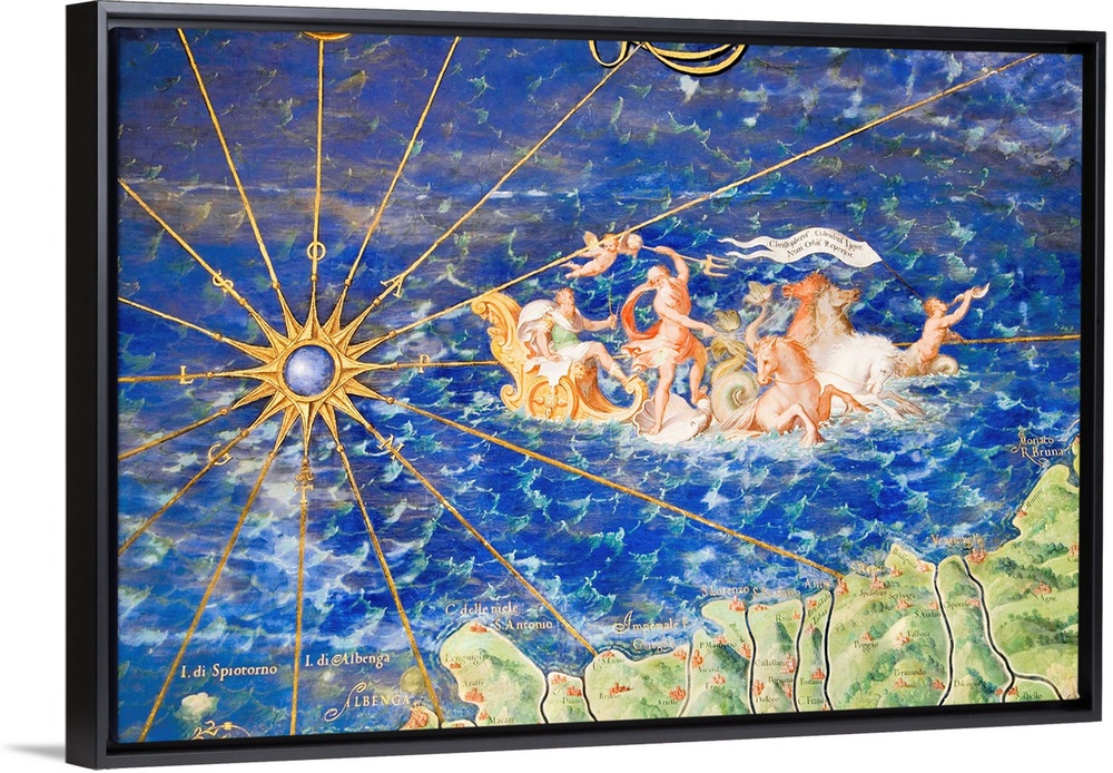 <p>Detail of 16th century map of Liguria. Detail from the map of Liguria commemorating Christopher Columbus and depicting Neptune, the Roman god of the sea, with his chariot. Liguria is a coastal region of Italy. The map of Liguria is contained in the Gallery of Maps in the Vatican Museum. The Gallery of Maps holds maps which were commissioned between 1578 and 1580 to show the regions of Italy and territories of the church. The maps are based on the work of Ignazio Danti, a 16th century Italian priest, mathematician, astronomer and cosmographer, and are an important record of 16th century geography.</p>