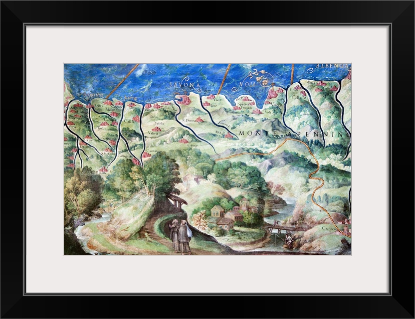 <p>Detail of 16th century map of Liguria. Detail from the map of Liguria, from Genoa (far left) to Albenga (far right), showing Savona (middle), the water courses and the Apennine mountains (labelled). This map of Liguria is contained in the Gallery of Maps in the Vatican Museums. The Gallery of Maps holds maps which were commissioned between 1578 and 1580 to show the regions of Italy and territories of the church. The maps are based on the work of Ignazio Danti, a 16th century Italian priest, mathematician, astronomer and cosmographer, and are an important record of 16th century geography.</p>