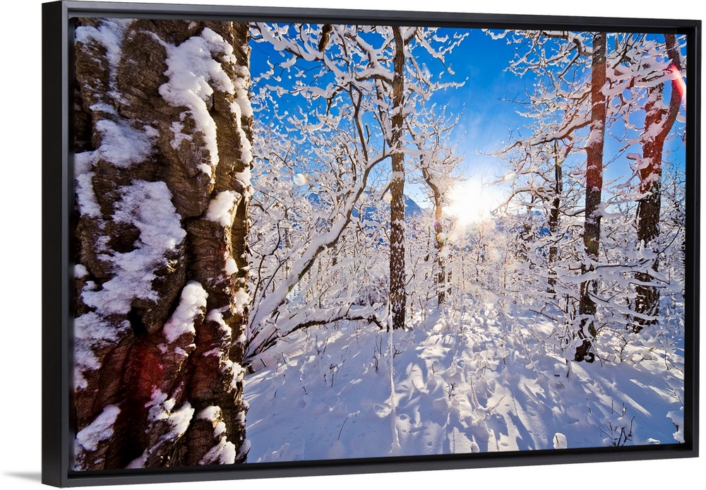 <p>Giant landscape photograph of a snow covered forest of cottonwood trees, the sun shining brightly in the background, against a blue sky, on Artic Valley Road, in Anchorage, Alaska.</p>