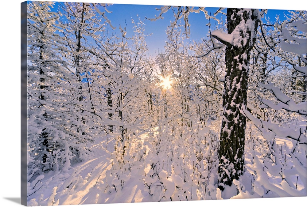 <p>Photograph of snowy forest with sun peaking through branches.</p>