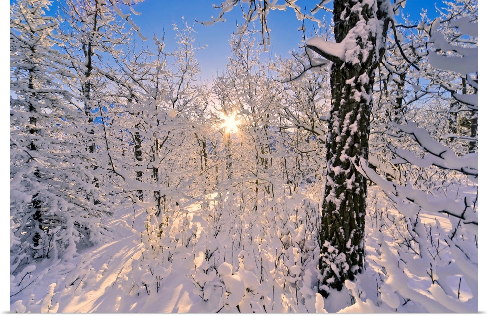 <p>Photograph of snowy forest with sun peaking through branches.</p>