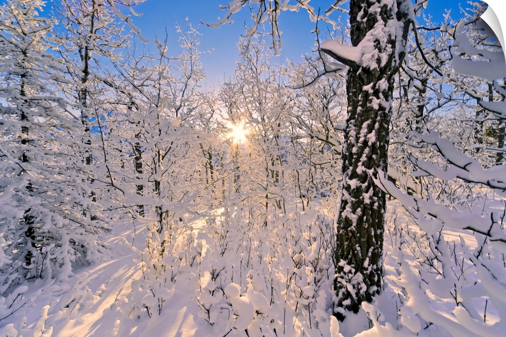 <p>Photograph of snowy forest with sun peaking through branches.</p>