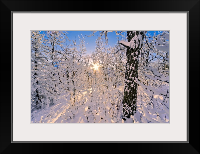 <p>Photograph of snowy forest with sun peaking through branches.</p>