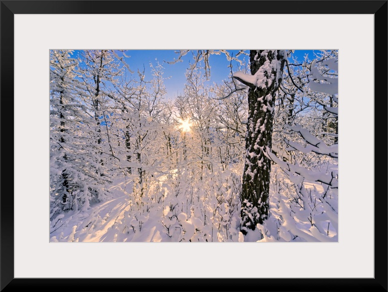<p>Photograph of snowy forest with sun peaking through branches.</p>