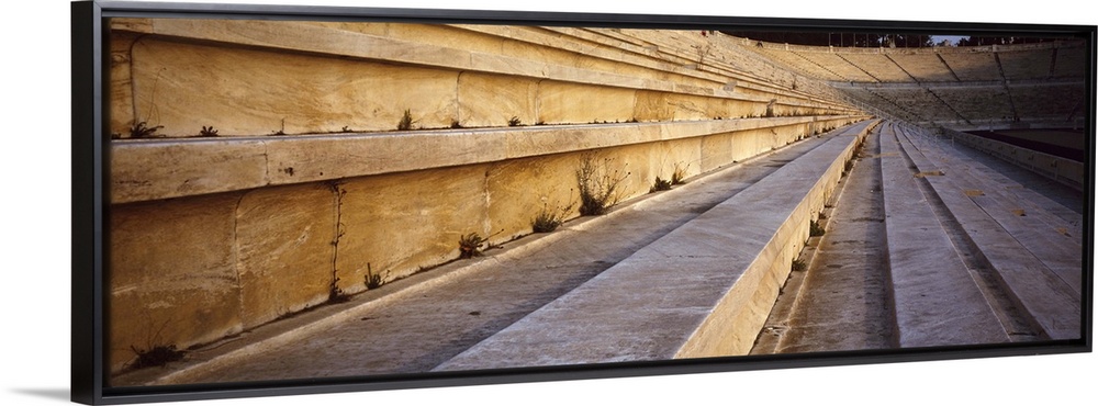 <p>Panoramic photograph of wooden seats in ancient coliseum.</p>