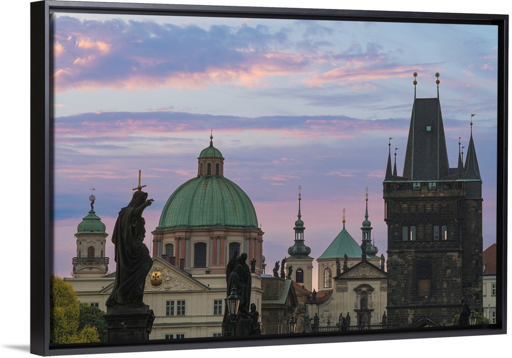 <p>Details of statues and spires at Charles Bridge at sunrise, featuring dome of Church of Saint Francis of Assisi and Old Town Bridge Tower, UNESCO World Heritage Site Prague, Bohemia, Czech Republic (Czechia), Europe</p>