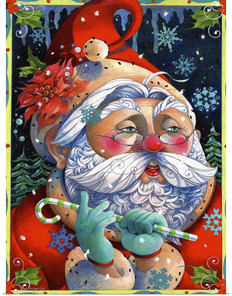 <p>Contemporary artwork of Santa Claus holding a candy cane against a background of snowflakes.</p>