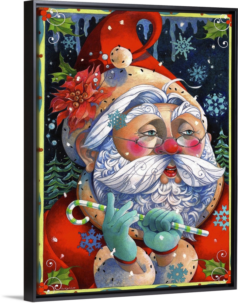 <p>Contemporary artwork of Santa Claus holding a candy cane against a background of snowflakes.</p>