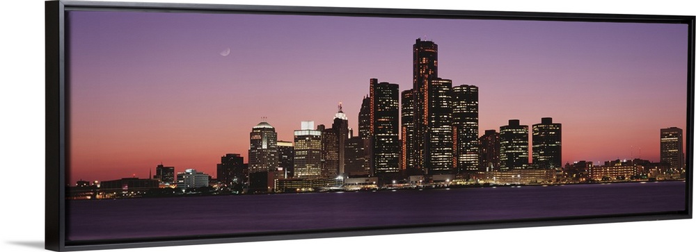<p>Panoramic photograph of skyline and waterfront lit up at sunset with the moon high in the sky.</p>