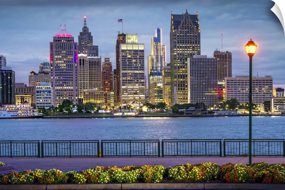 <p>USA, Detroit, Michigan, Skyline View From Windsor, Canada Riverfront Trail, Across The Detroit River, New Hudson Building.</p>