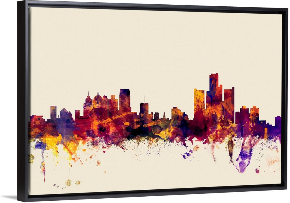 <p>Contemporary artwork of the Detroit city skyline in watercolor paint splashes.</p>