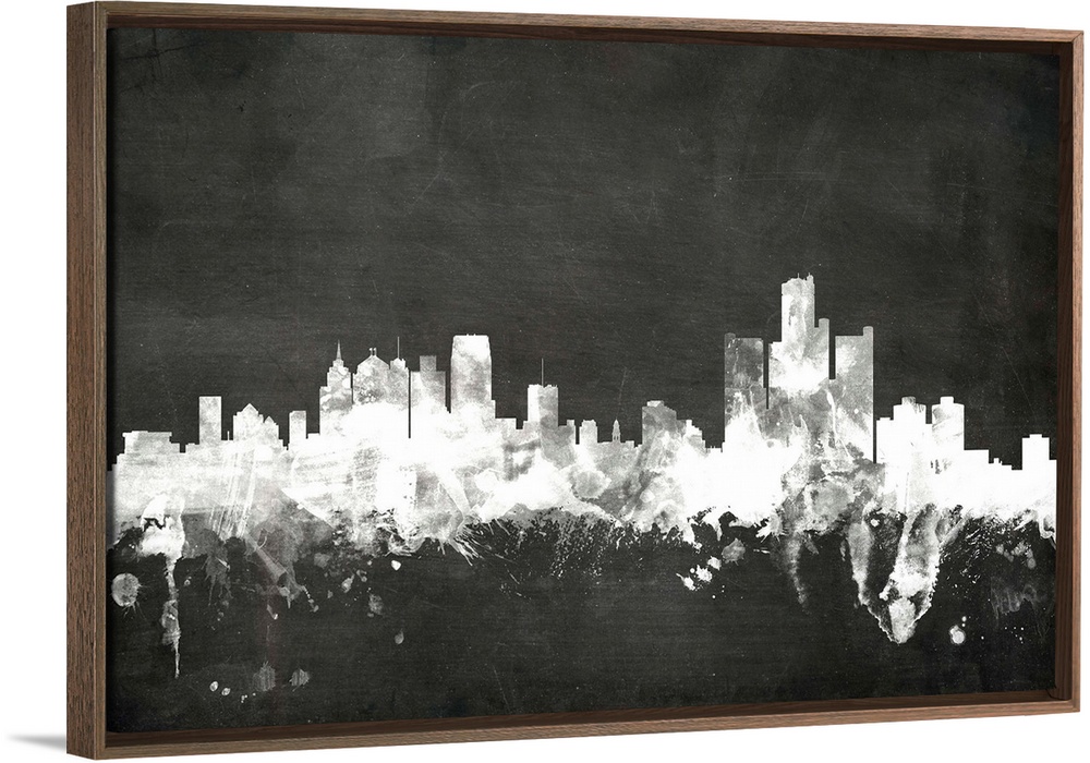 <p>Smokey dark watercolor silhouette of the Detroit city skyline against chalkboard background.</p>