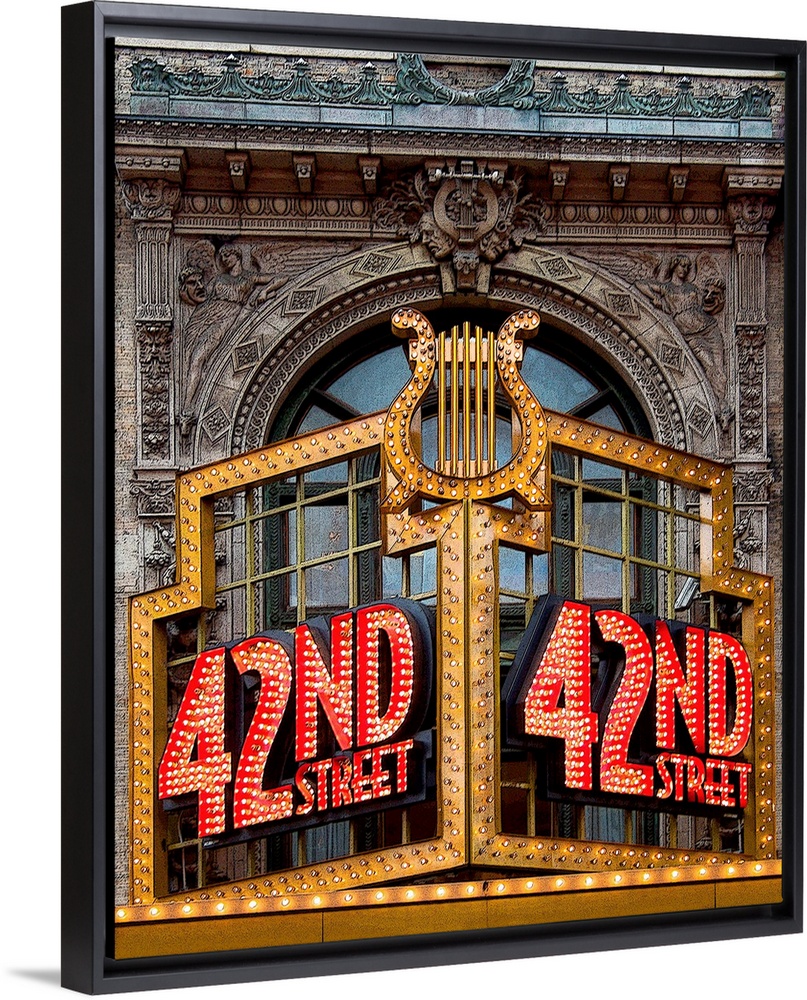 <p>Vibrant photograph of a lit up 42nd street sign on the facade of a building.</p>
