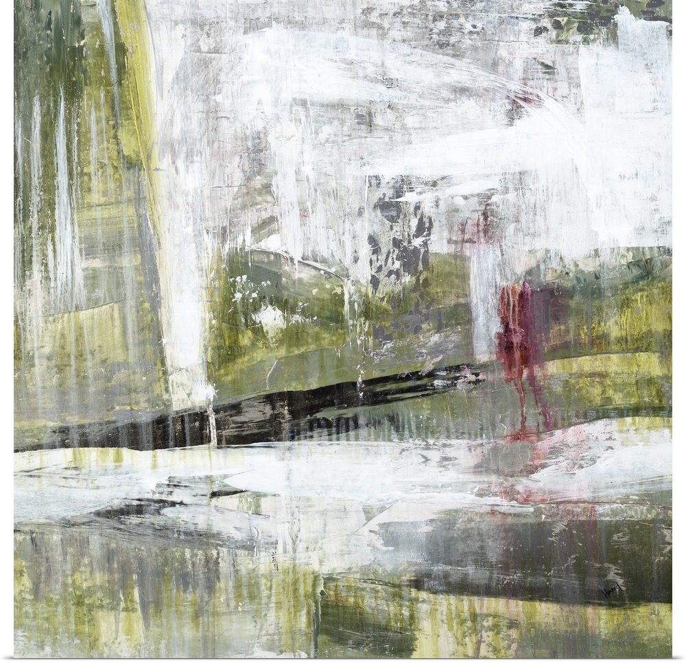 <p>Contemporary abstract painting using weathered and faded dark green and splattered and smeared white.</p>