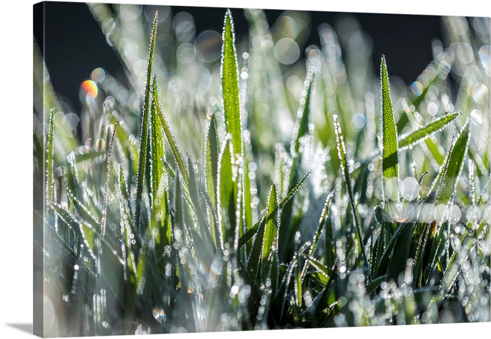 <p>Dew reflects light in the lawn; Astoria, Oregon, United States of America</p>