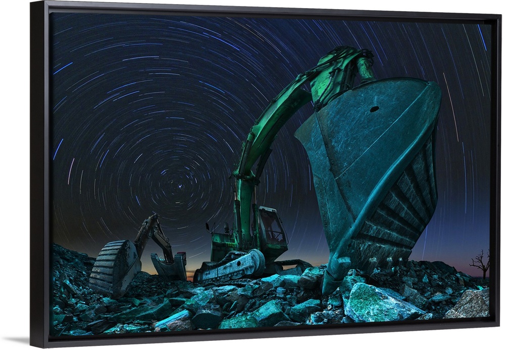 <p>Wide angle photo of two excavators under the night sky with star trails.</p>