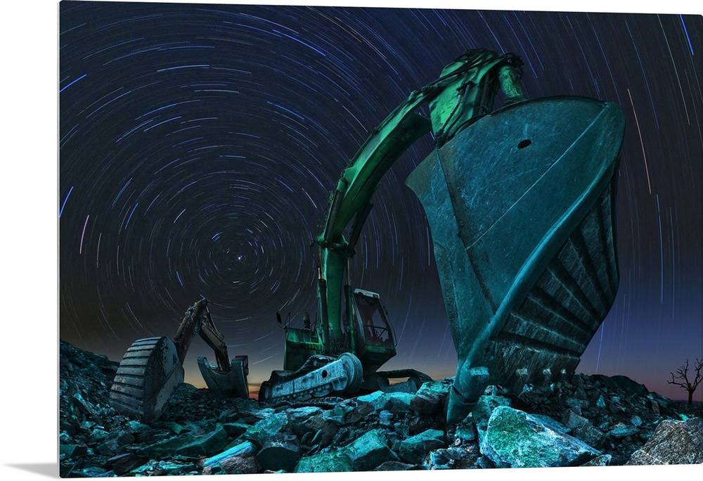 <p>Wide angle photo of two excavators under the night sky with star trails.</p>