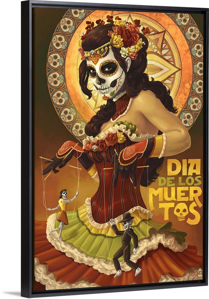 <p>Retro stylized art poster of a woman in an elegant dress, and her face painted like a skull. While holding marionette puppets.</p>