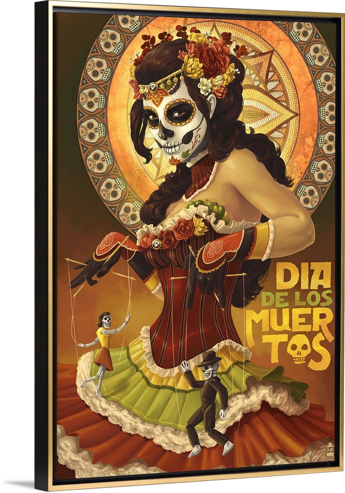 <p>Retro stylized art poster of a woman in an elegant dress, and her face painted like a skull. While holding marionette puppets.</p>