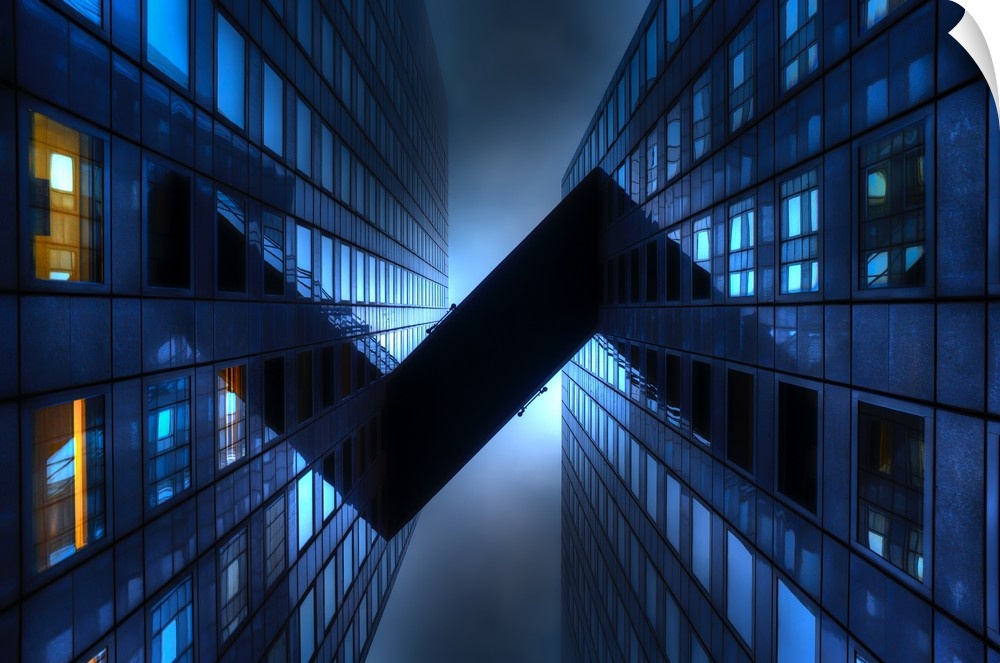 <p>A catwalk between two buildings at an angle, seen from below.</p>