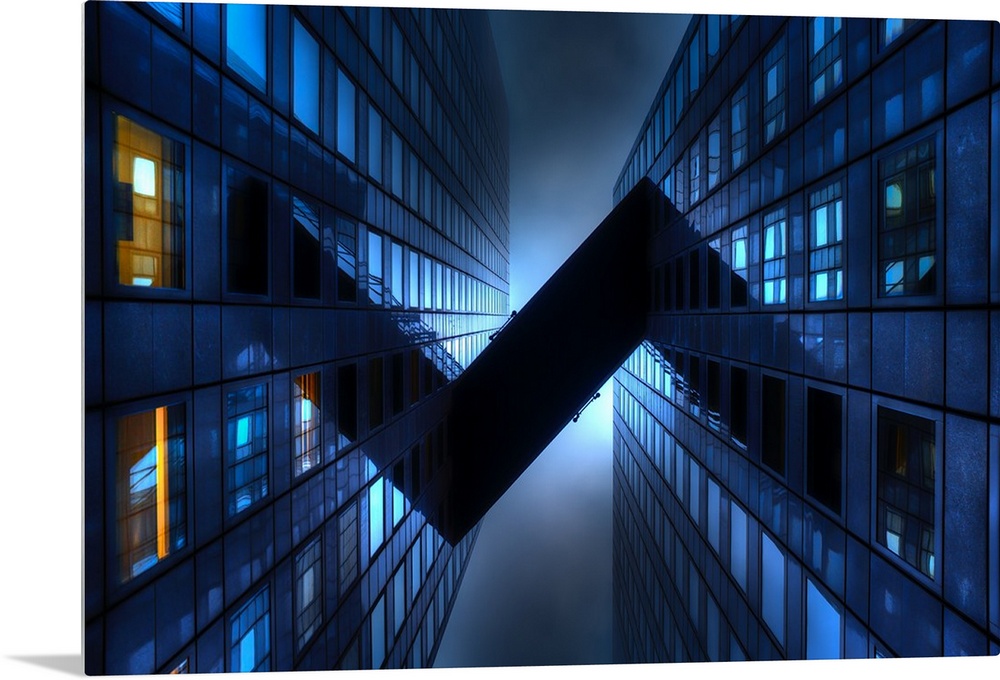<p>A catwalk between two buildings at an angle, seen from below.</p>