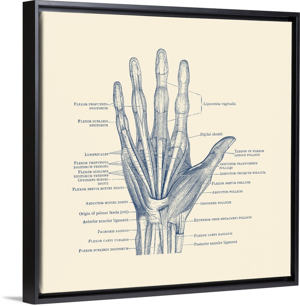 <p>Diagram depicting the bones, ligaments and muscles throughout the hand and fingers.</p>