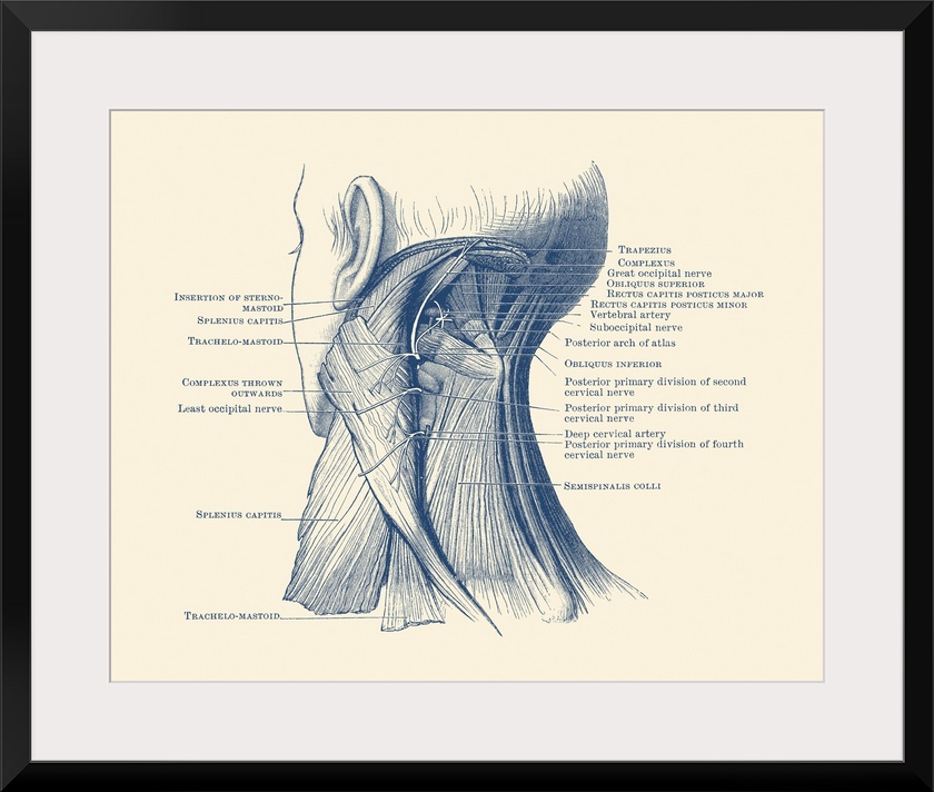 <p>Diagram of the muscular system on the back of a human neck.</p>