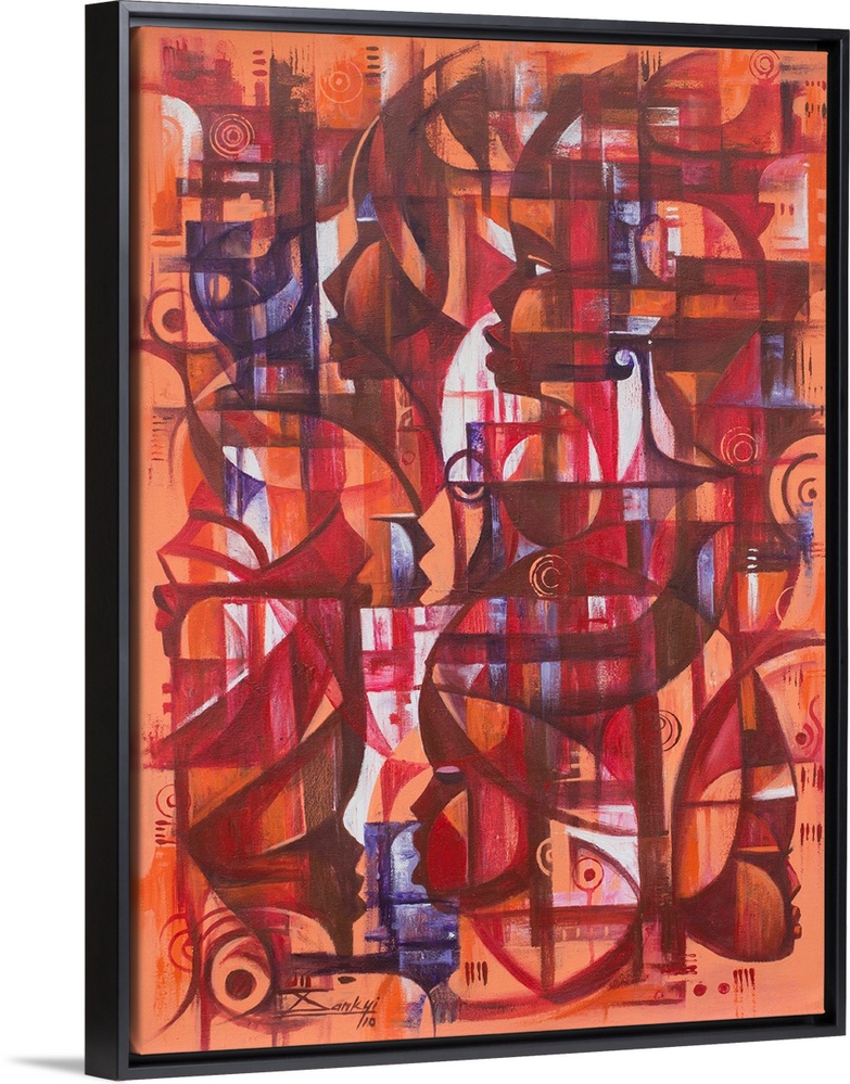 <p>Bright Dankyi Mensah skillfully captures the busy rhythm of a Ghanaian market as he paints with abstract stylizations. The faces of vendors, customers and friends emerge amongst busy patterns. They are catching up on local news, sharing gossip, explains the talented artist.</p>