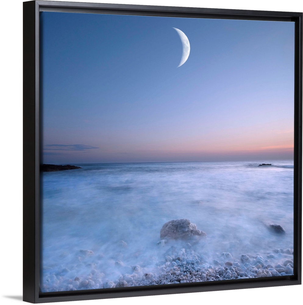 <p>This large art piece highlights a crescent moon with fog cascading over the rocks and water below.</p>