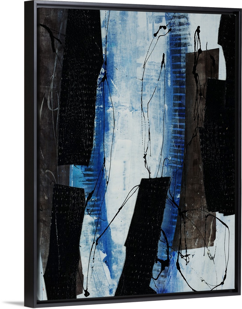 <p>Abstract painting of several dark rectangular blocks surrounded by swirling, thinly dripped paint lines on a background of cool vertical shapes that blend into a light background.</p>