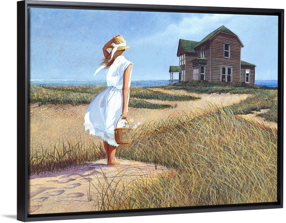 <p>Woman in a white dress with a straw hat on holding a basket of flowers on sandy beach looking at a beach front house.</p>