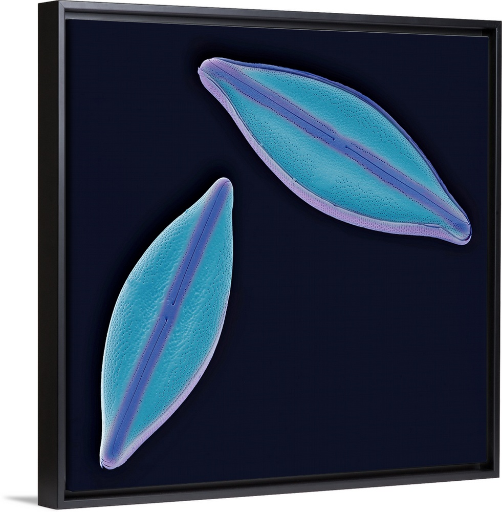 <p>Diatoms. Coloured scanning electron micrograph (SEM) of two diatoms (navicula sp.). Diatoms may be extremely abundant in both freshwater and marine ecosystems; it is estimated that 20 to 25 of all organic carbon fixation on the planet is carried out by diatoms. This is possible because they contain chlorophyll. Diatoms are a major food resource for marine and freshwater microorganisms and animal larvae, and are a major source of atmospheric oxygen. A unique feature of diatom cells is that they are enclosed within a cell wall made of silica (hydrated silicon dioxide) called a frustule. Magnification: x500 when printed at 10 centimetres wide.</p>