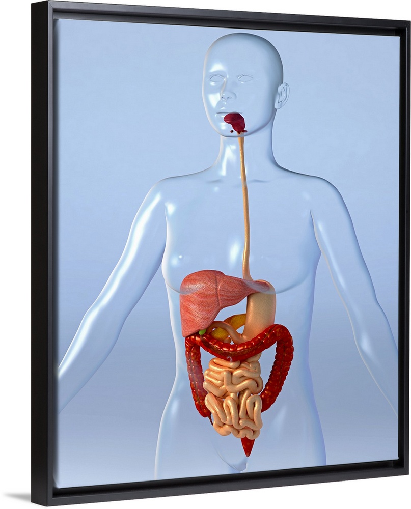<p>Digestive system. Computer artwork of a naked woman with a healthy digestive system. Food is ingested through the mouth and passes down the oesophagus (long thin tube) to the stomach. The food is stored and partially broken down in the stomach before moving on to the small intestine (coils, centre) to be digested. Food residue passes from the small intestine to the large intestine (ribbed) where excess water is reabsorbed. The faeces is then expelled through the anus.</p>