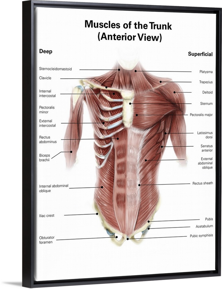 <p>Digital illustration of muscles of the human torso, anterior view.</p>