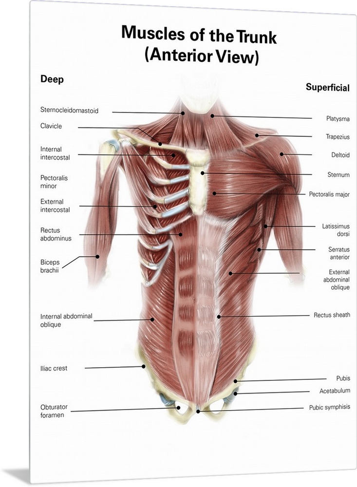 <p>Digital illustration of muscles of the human torso, anterior view.</p>