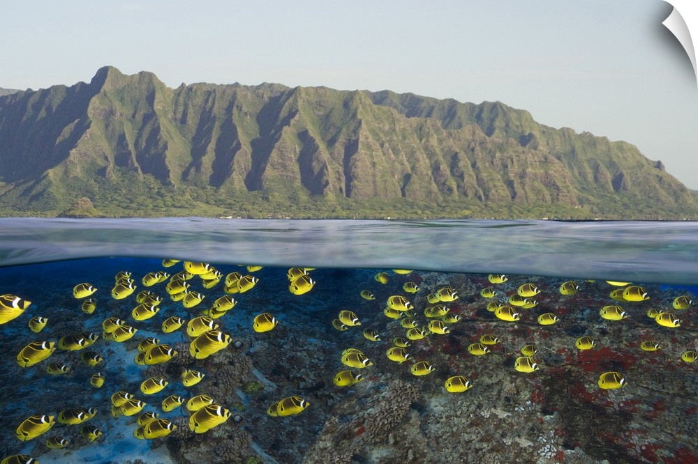 <p>Digital split image of schooling raccoon butterflyfish off Oahu, Hawaii.</p>