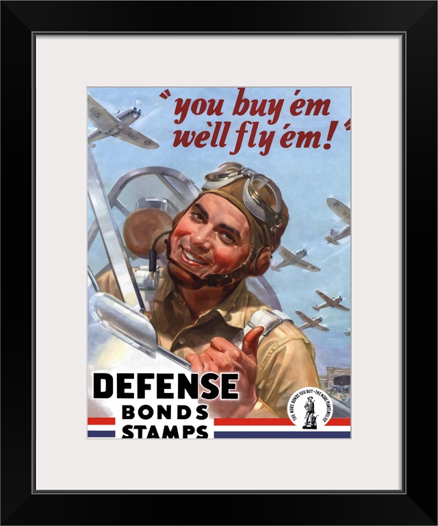 <p>Digitally restored vector war propaganda poster. This vintage World War Two poster features an American fighter pilot, giving the thumbs up from his plane, in a plane filled sky. It declares - You Buy 'em, We'll Fly 'em -- Defense Bond Stamps.</p>
