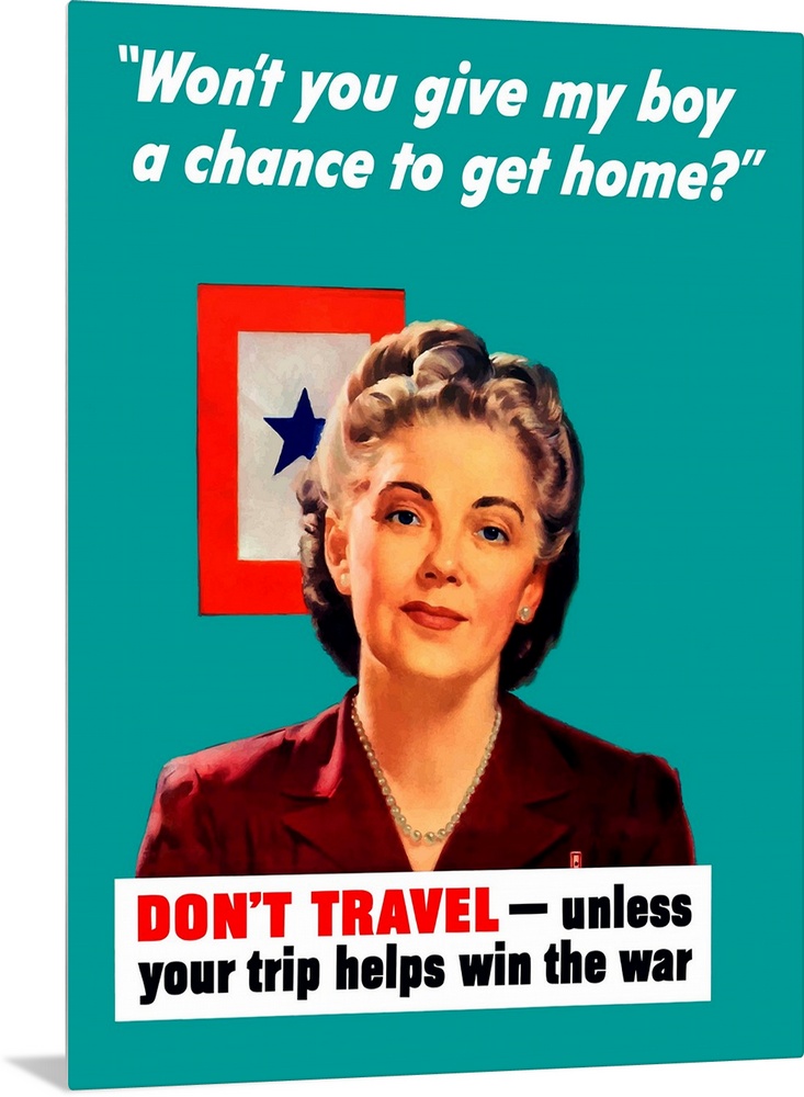 <p>Digitally restored vector war propaganda poster. This vintage World War Two poster features a blue star mother. It declares - Won't you give my boy a chance to get home? Don't travel, unless your trip helps win the war.</p>